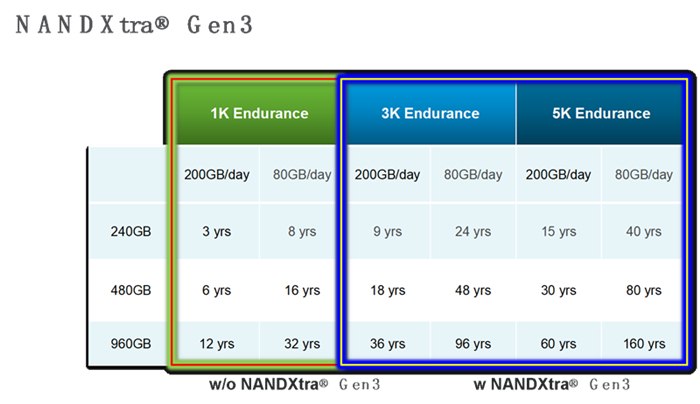 長期的測試結果顯示,在NANDXtra® Gen3可靠性引擎的加持下,閃存顆粒平均使用壽命整體提升3到5倍,為采用QLC顆粒的SSD企業以及搭載使用QLC顆粒SSD的整機企業免去后顧之憂。