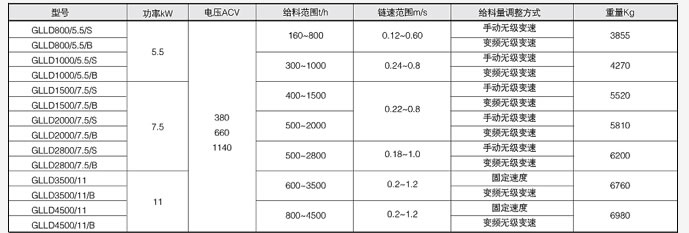 示例:客定給料能力為1000t/h,裝載功率為5.5KW的手動調速鏈帶式給料機型號表示為GLLD1000/5.5/S
